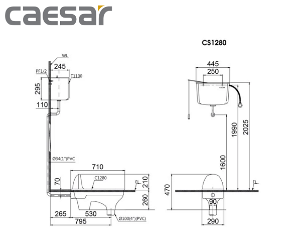 Bản vẽ kỹ thuật bàn cầu xổm C1280 Caesar