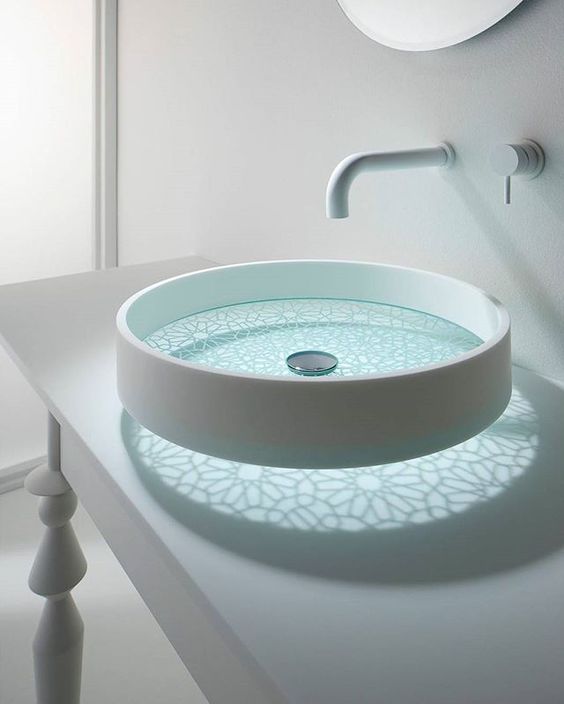 Bồn rửa đặt bàn bằng thủy tinh hoa văn phản chiếu ánh sáng mang lại cho bạn sự cuốn hút và mát mẻ như đang dưới thủy cung.