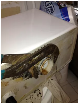 Nếu các đai ốc không bị bong ra do ăn mòn, bạn có thể cắt bu-lông ra giữa bể và bát, sử dụng lưỡi cưa sắt. Sau khi tháo bu lông bể, cẩn thận nhấc bể ra khỏi bát và đặt nó lên một bề mặt ổn định nơi bạn có thể làm việc thay thế.