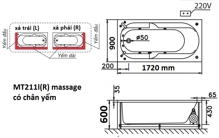 - Chữ cuối là chữ C là bồn tắm massage đèn: MT7180C, MT0660C