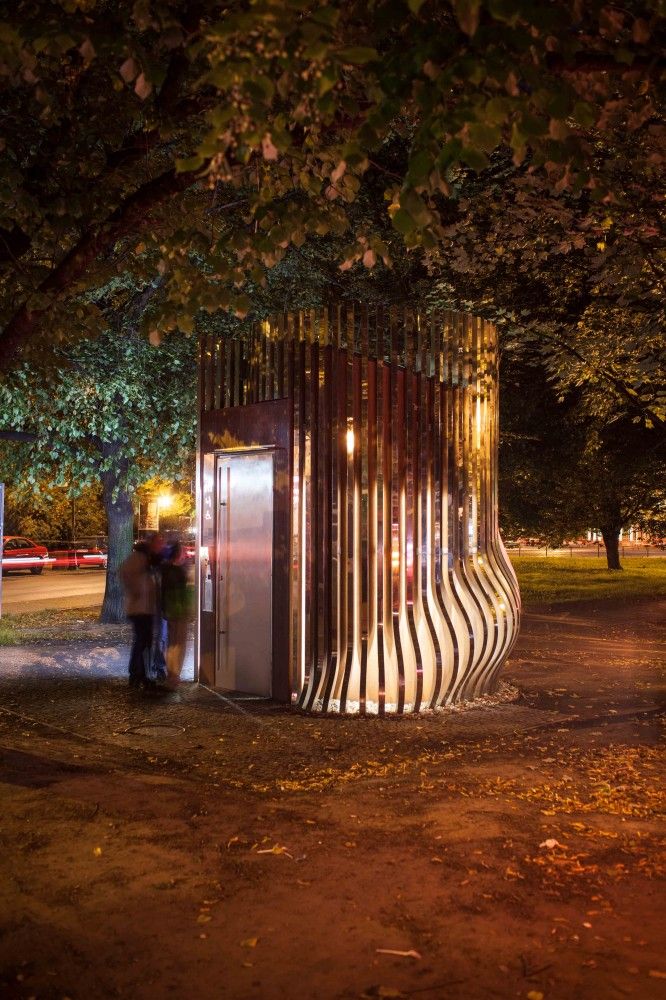 Nhà vệ sinh công cộng này được thiết kế thiết thực và phong cách, mang lại sự sinh động cho thành phố với hình dáng độc đáo của chúng. Dạng hình trụ của cấu trúc phình ra ở phần chân với hình dạng gợi nhớ đến giọt mưa. Trong khi đó, các sườn thép dọc bao quanh bên ngoài của nhà vệ sinh công cộng đóng vai trò như một giá để xe đạp, đảm bảo rằng công trình sẽ luôn được cộng đồng sử dụng.