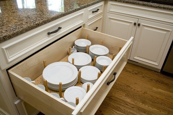 Đồ sành sứ có thể được cất giữ trong những ngăn kéo sâu bên dưới không gian quầy của bạn . Các vách ngăn và khay chứa có thể được di chuyển để chứa các loại đĩa và bát có kích thước khác nhau và đảm bảo rằng đĩa không bị trượt! Một chiếc giá bằng sành sứ có thể lắp phía trên bồn rửa cũng là một ý tưởng tuyệt vời. Móc gắn bên dưới có thể đựng cốc và muôi.