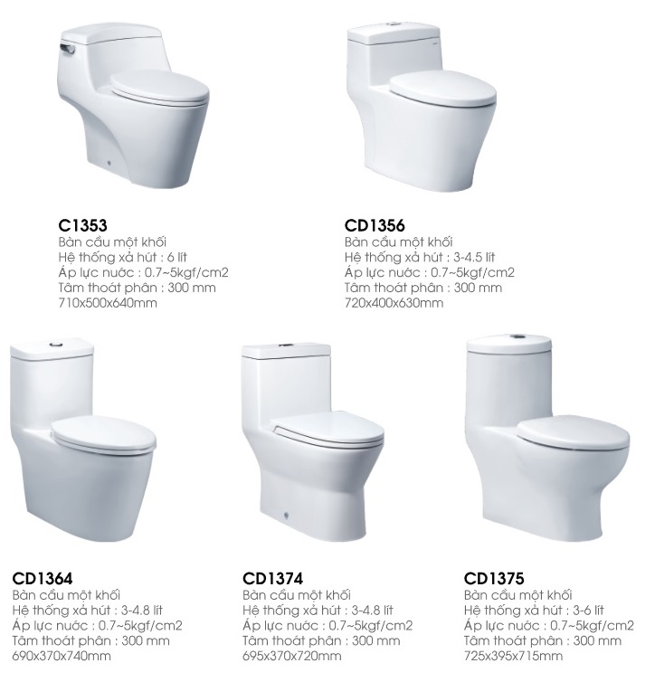 Bàn cầu một khối Caesar có đặc điểm khác nhau tùy theo mẫu mã mà dùng khác nhau, phân biệt dựa vào hệ thống xả hút, Áp lực nước hoặc tâm thoát phân. Các mã bàn cầu một khối Caesar gồm C1353, CD1356, CD1364, CD1374, CD1375...